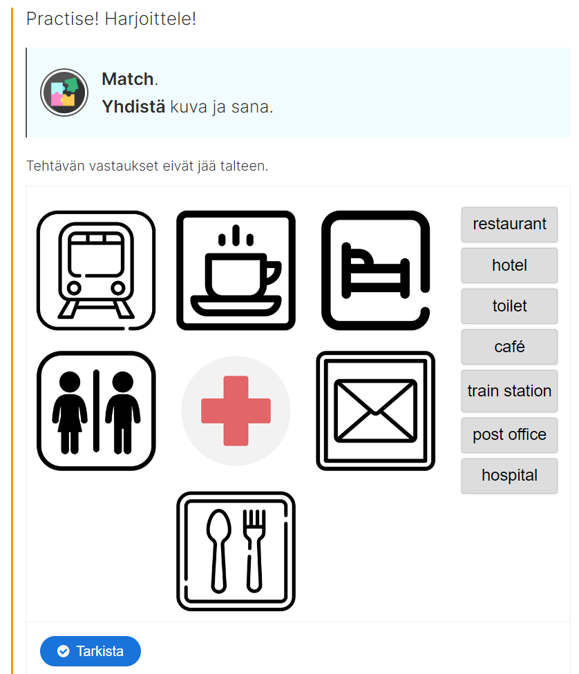 Harjoitustehtävinä on runsaasti H5P:llä tehtyjä tehtäviä, jotka tuovat kursseille lisää keveyttä ja visuaalisuutta. Uusista sanoista on usein ensin yhdistämistehtävä, josta kaikentasoiset opiskelijat voivat saada onnistumisen kokemuksia sekä varmuutta ja rohkeutta muihin tehtäviin.