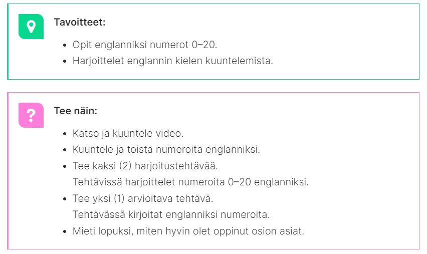 Kurssien jokainen osio alkaa johdannolla, jossa on kerrottu tiiviisti osion tavoitteet ja opiskeluohjeet. Nämä auttavat valmistautumaan tulevan osion opiskelemiseen.