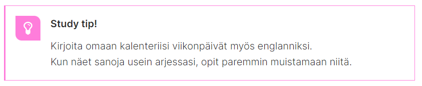 Kursseilla on myös opiskeluvinkkejä (study tip), joista opiskelija saa vinkkejä englannin kielen harjoitteluun omassa arjessaan.
